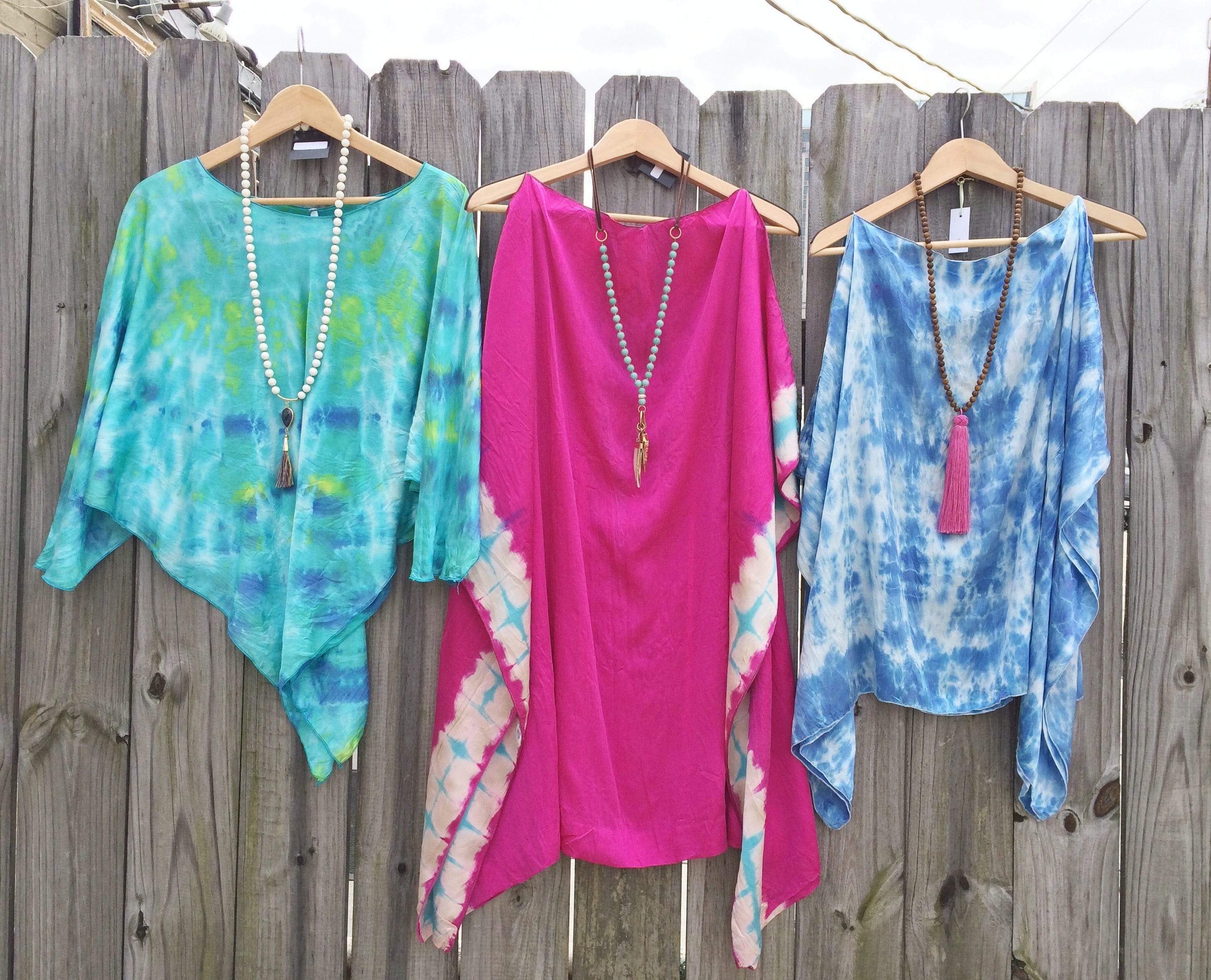 Inspiration for color palettes comes from the beauty of nature. Each piece offered is handmade and hand dyed in house and totally unique. Silhouettes which move and flow with the body give an elegant yet carefree look. One size fits most.